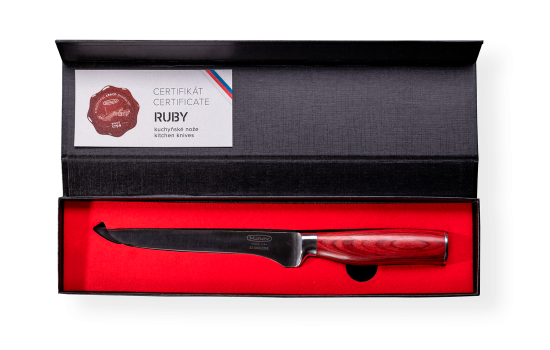 Vykosťovací nůž Ruby je vyroben z korozivzdorné oceli DIN 1.4116 doplněn střenkou z ergonomicky tvarovaného dřeva. Vhodný do domácnosti i restauračního provozu. Čepel je opatřena kováním chránícím prsty při krájení.