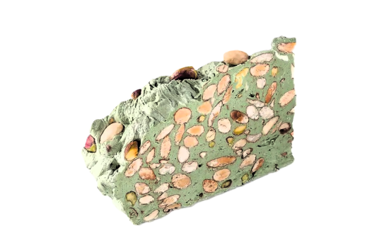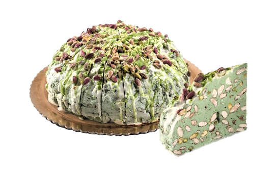Krémová italská torrone. Také známý jako "bílý nugát" nebo "francouzský nugát" a zde přidáno amaretto podle italské receptury. Torrone má měkkou a mírně vlhkou texturu a vyrábí se podle tradic, které sahají stovky let do minulosti v oblasti Cremona. Revoltiniho torrone se vyrábí z velmi kvalitních surovin a kromě cukru a glukózového sirupu se skládá především z medu a mandlí. To tvoří „základ“ receptury. Tento bílý nugát není tak sladký jako tradiční francouzský nugát často, protože se používají extra mandle a glukózový sirup, což společně snižuje obsah cukru. Revoltiniho nugát je proto velmi oblíbený i mimo Itálii a přizpůsobený severským podmínkám. Kromě základu v Revoltiniho torronu se přidává i řada lahodných ingrediencí, takže na výběr máte spoustu vzrušujících variant, včetně této varianty s pistáciemi. Všechny nugátové dorty a řezy jsou vyráběny "incarnata", to znamená, že ochucovací krém v dortu se nepřidává pouze na vrch jako ozdoba, ale je obsažen i v samotném dortu, pokud jsou ručně vyráběny. Rivoltini se řídí původní cremonskou recepturou, a proto je velmi podobný tradičnímu měkkému francouzskému nugátu, jen není tak sladký. A je pravděpodobně starší než francouzský nugát, protože recept sahá až do 14. století. Stále se o tom vášnivě diskutuje...