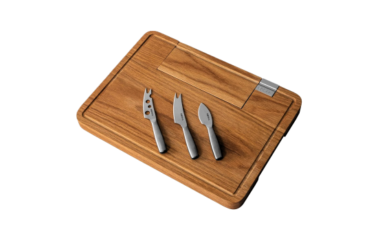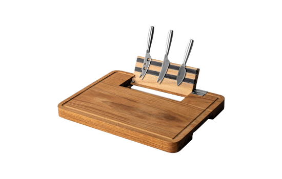 Překvapte svou rodinu a přátele lahodným sýrem, tapas nebo jiným občerstvením. Myslíme, že budete souhlasit, že na tomto dubovém prkénku vypadají ještě chutněji. Jakmile s noži skončíte, jednoduše je uložte do praktického úložného prostoru, který najdete na spodní straně desky. Případně je uložte na magnetické proužky desky. Díky tomu budou vaše nože v bezpečí a budou také snadno přístupné.